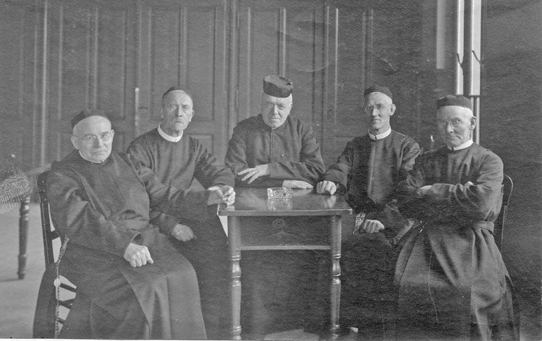 Lezers en Kijkers Bovendien de kiekje zag er uit de 5 aanwezige zo akelig gezichten. Dat ze droegen helemaal de kelpjes van hun het geloof, zoals vroeger de katholiek geestelijken droegen het verplicht de kelpje zoals het voorbeeld van de Heilige Vader Paus. En nu nog verder wel gebruikt voor de kale hoofd zoals Mgr Hermus heeft zijn hele leven de ovaal kelpje gedragen en zag nu de officeel dat hij heeft zijn de bovenhoofd geheel kaal. Rechts zat de naast van Mgr Hermus die heet Br Chrijsologus de groepleider van de jongens en later als het hoofd van de kleermakerij.en de links de naast van Mgr Hermus de broeder ? De vergelijking de staande van links naar rechts de tweede broeder zie de foto log nr 15. De vierkant tafeltje was een lege plekje en behalve de asbak. Met de vergroot foto zag de onder van de tafeltje zat een luidspreker die werd gebruikt voor de oproep en werd de spech van de overste gehouden. En dan waar bleef de glaasjes borrel, sigaren, hapjes, dat hadden ze wel die werd in de kast weggelegd. Rookt Mgr Hermus de sigaar of pijp dat heb ik nooit gezien. De tafeltje en stoelen werden door de handwerk gemaakt die lijktt wel op de antiek voor de waarde van het geld. Geheel links op de stoel vermoed ik dat hij was de overste van de broeders. Deze fotoo werd gemaskt bij de broeders rekreatiezaal in 1925. Rene van der Veen.
